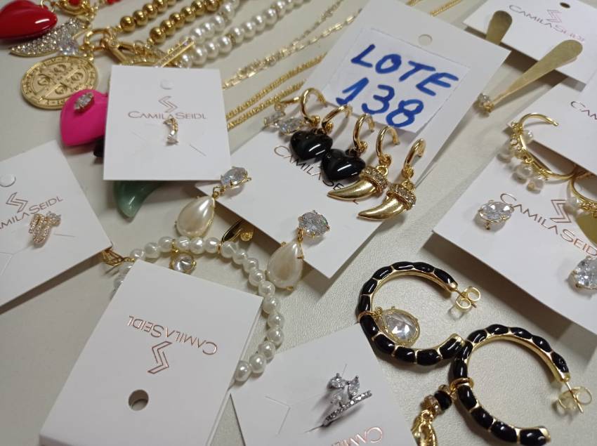 Lote: 138 - JÓIAS » DIVERSAS (80 UNID) SEMIJÓIAS DIVERSAS "CAMILA SEIDL": 57 UND BRINCOS; 16 UND COLARES / CHOKERS; 03 UND CORRENTES / PINGENTES; 04 UND PULSEIRAS.